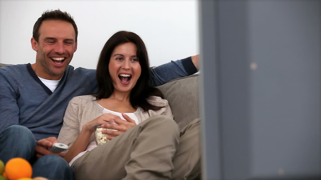 - Happy Couple Enjoying Movie Night Together on Sofa