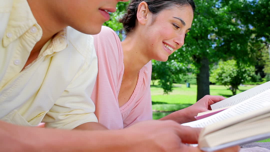 - Happy Couple Reading together in Park Relaxing Outdoors