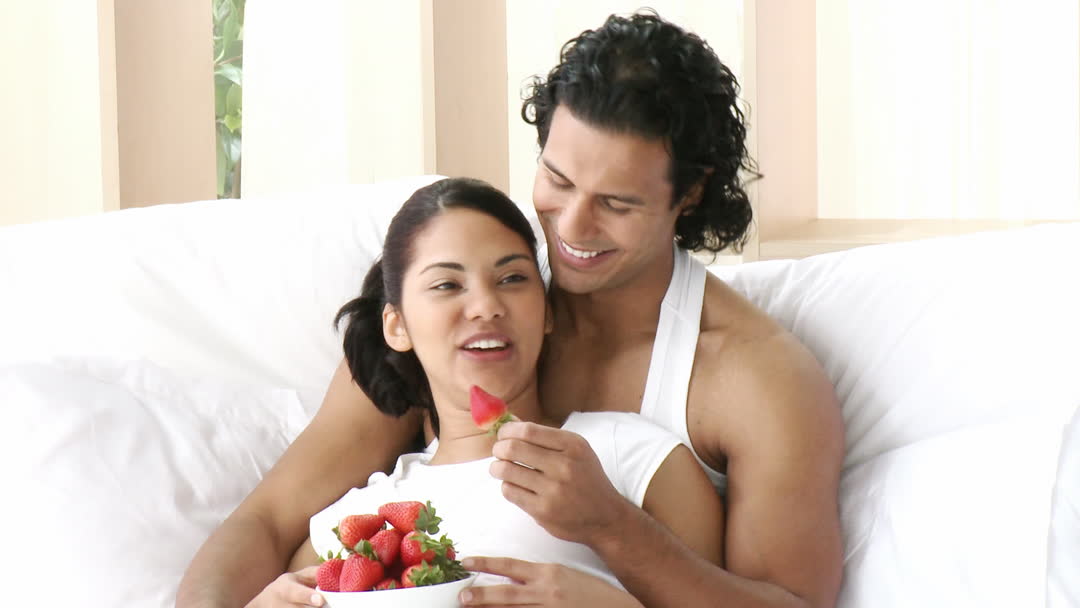 - Happy Couple Relaxing in Bed Enjoying Strawberries