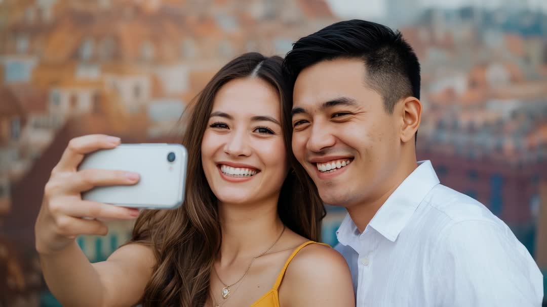 AI Generated Video. A joyful couple with big smiles taking a selfie against a backdrop of a city's rooftops. They are on a rooftop, capturing a moment of romance and connection. Ideal for content related to modern romance, city living, and capturing memories. Can be used in lifestyle blogs, social media posts, or advertisements promoting urban experiences or smartphone technology.