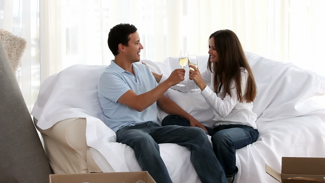 This video shows a smiling couple clinking glasses of champagne as they sit comfortably on a sofa. The relaxed pose and fresh setting suggest a celebration of a significant milestone, such as moving into a new home. Ideal for use in articles and advertisements about lifestyle changes, homebuying experiences, or festive moments with loved ones.