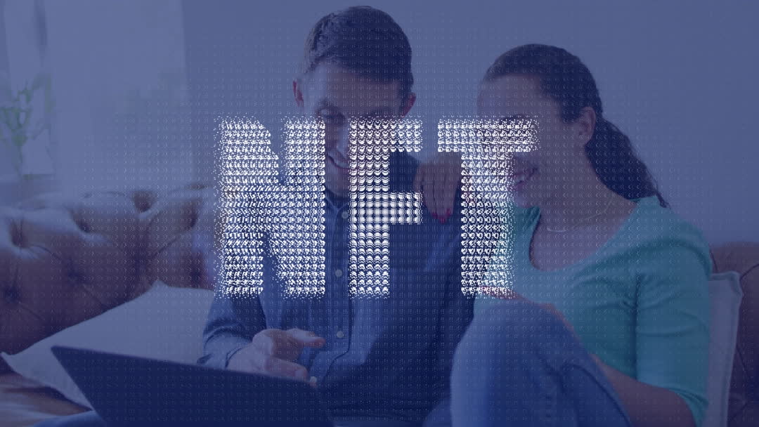 Happy Couple Using Laptop with NFT Concept Overlay Video