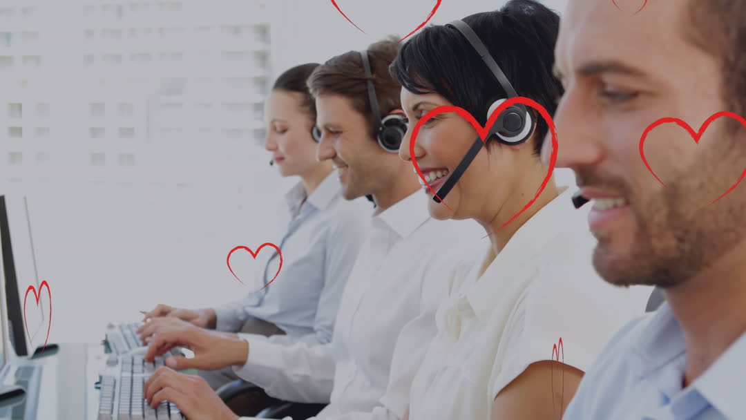 Image depicts diverse customer service representatives wearing headsets, smiling while assisting customers at their desks in a modern office. Heart drawings superimposed on the scene indicate a positive, caring interaction with clients. Useful for businesses showcasing teamwork, communication, and client-oriented service in their marketing materials, websites, or promotional campaigns emphasizing supportive service environments.