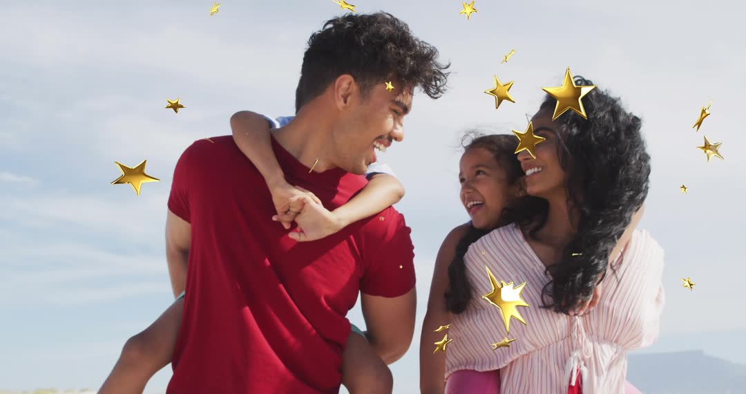 Family walks along a sunny beach having fun and laughing together. Floating golden stars add celebratory and dynamic atmosphere. Great for representing family vacations, joyful moments, or contentment-focused advertisements. Ideal for use in travel promotions and family lifestyle campaigns.