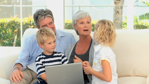 A family comprising grandparents and young children are gathered on a sofa with a computer. The cozy living room setting reflects modern family bonding over technology. Ideal for use in media focused on family life, digital learning, or modern living dynamics.