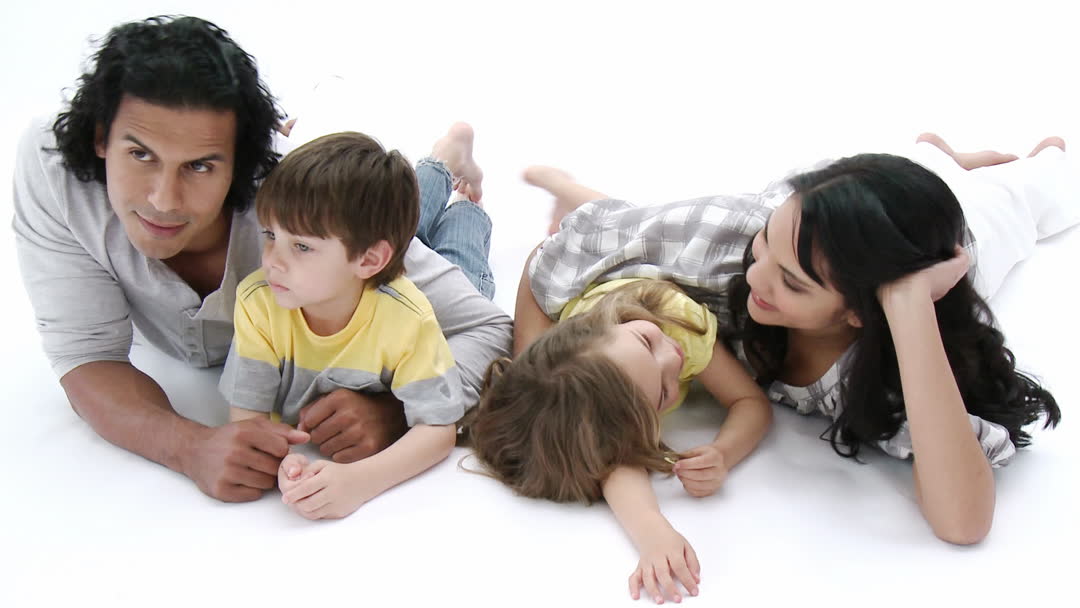 Image depicts a joyful family lounging together on a clean, crisp white background. They display expressions of unity and happiness. Perfect for promoting family-centric products, ads focusing on comfort, or articles about family bonding and home life.