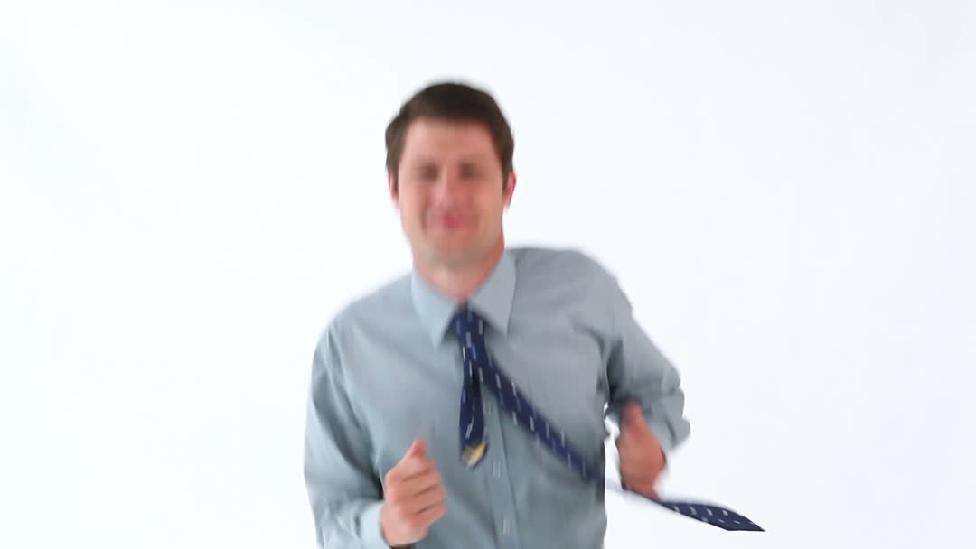 A cheerful man in business attire is jogging against a plain white background. His expression radiates energy, suggesting a fun and light-hearted break from work. This video is ideal for use in lifestyle blogs, corporate website promoting employee wellness programs, or advertising casual fitness activities for busy professionals.