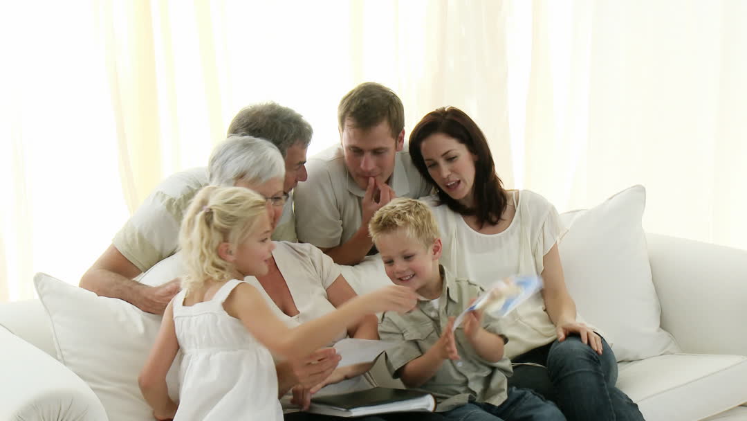 Happy Multigenerational Family Enjoying Photo Album at Home Video
