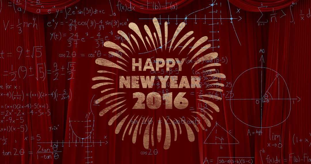 Text 'Happy New Year 2016' positioned against a red curtain filled with mathematical equations, this creative design combines festive elements with educational concepts, suitable for representing innovation, knowledge sharing, or use in academic celebrations during the year 2016. Useful for illustrating themes related to technology, education or innovative new processes.