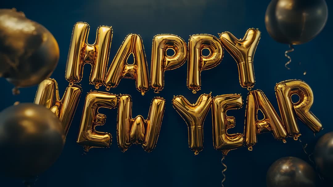 AI Generated Video. Video showing shimmering gold foil balloons spelling 'HAPPY NEW YEAR' floating against deep blue backdrop. Shifting studio lights creating reflective highlights and soft shadows, round metallic balloons and curled ribbons drifting in gentle motion. Footage featuring slow-motion shimmer, rich gold tones and cinematic contrast, optimized for looping. Suggested uses including New Year greetings, social media countdowns, event promos, website hero headers, digital invitations, seasonal sale banners, party title cards, broadcast lower thirds, background for livestreams and virtual events. Providing space for overlay text and logo placement. Suggesting loop durations of 5-15 seconds and adding festive audio sting. Color palette featuring gold and navy blue, glossy finish, upscale celebratory mood.