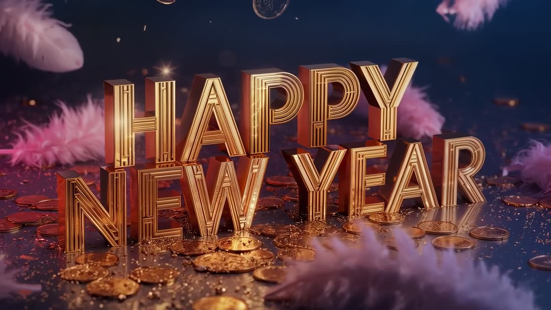 AI Generated Video. Footage showing 3D gold letters 'HAPPY NEW YEAR' with coins dropping onto reflective surface, pink feathers drifting, glitter scattering and warm bokeh lighting. Camera panning slowly across text, coins bouncing and glitter catching highlights for luxurious cinematic look. Useful for social media countdowns, event promotions, party invitations, retail holiday ads and greeting animations. Ideal for opening title for New Year broadcast, online banner, in-store loop, luxury brand campaign and financial prosperity message. Compatible with 4K and HD timelines, loopable clip, color grading friendly and usable with text overlays or logo stings.