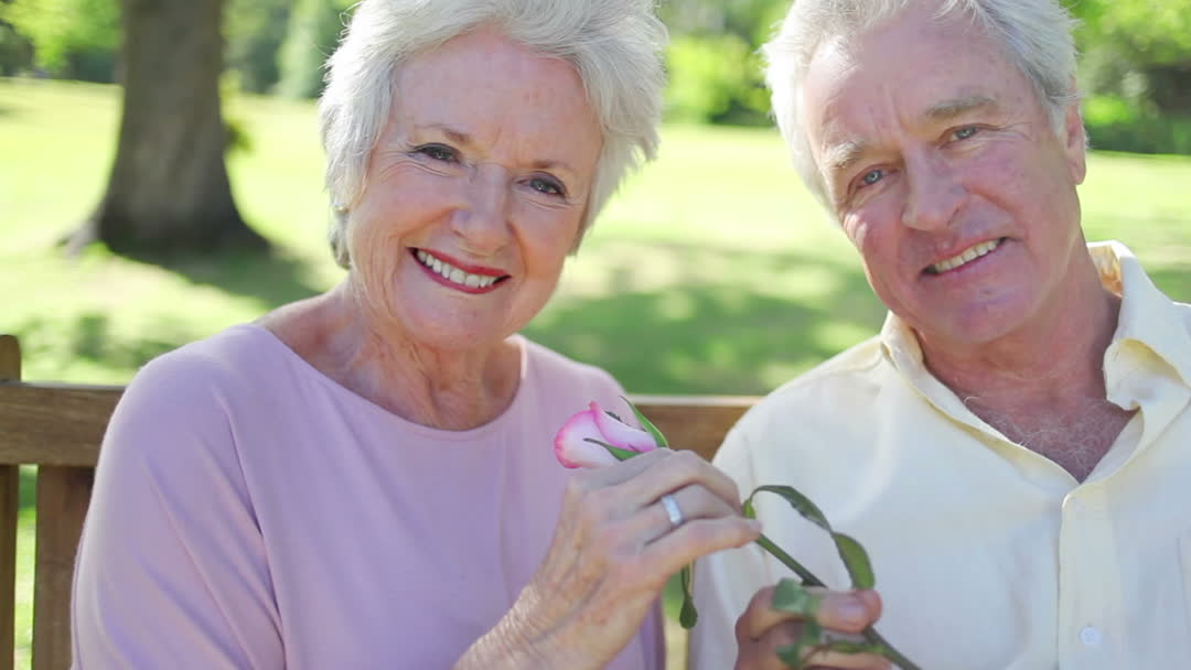 Senior couple enjoys a peaceful day in the park. The woman is holding a rose and both are smiling, suggesting contentment and affection. This video is perfect for illustrating concepts of happy relationships, retirement lifestyle, quality time, love during senior years, and peaceful leisure activities. Great for use in advertisements, brochures, or websites related to senior living, geriatric wellness, dating services for the elderly, and campaigns focused on celebrating life at any age.