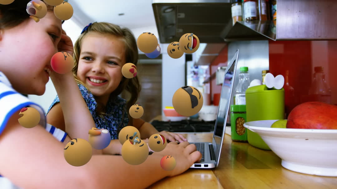 Happy Siblings Using Laptop with Fun Emojis Overlay Video