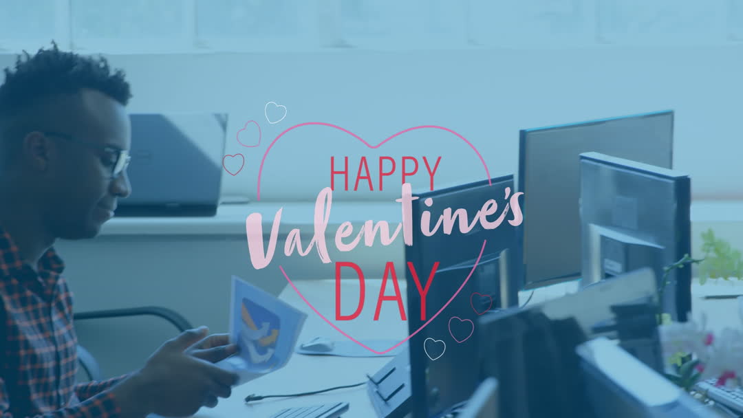 This animated visual features a festive Valentine’s Day greeting over an office setting with diverse businessmen engaged with documents at their desks. The cheerful theme and inclusive representation can be useful for corporate Valentine’s Day promotions, social media content, internal company celebrations, or digital advertisements that blend professional and festive motives.