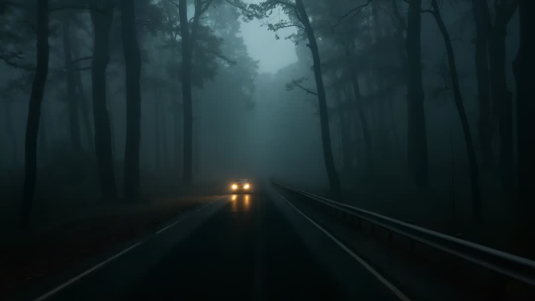 AI Generated Image. Video following car headlights cutting through dense fog on dark forest road, approaching viewer while lights reflect on wet asphalt. Scene conveying suspense and solitude, using deep blue-green tones and soft contrast to enhance mood. Ideal for thriller trailers, automotive safety campaigns, weather reports, blog headers, social media ads, book covers, and cinematic B-roll. Useful for overlaying headline text, lower-third graphics, or title sequences in video edits. Suitable for messaging about low visibility, safe driving tips, insurance marketing, emergency services, or atmospheric travel storytelling.