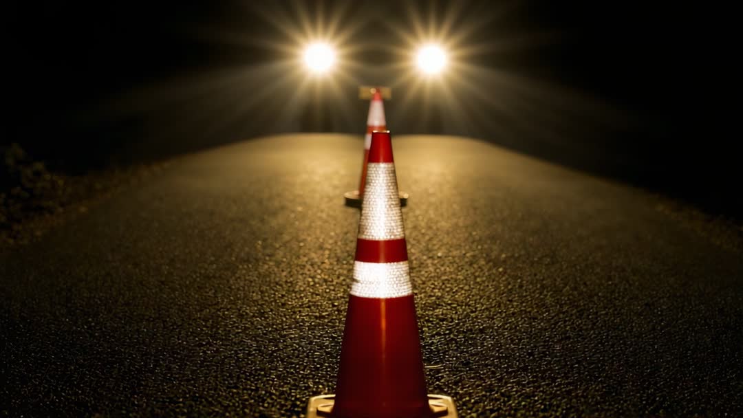 AI Generated Image. Showing close-up of orange reflective traffic cone centered on asphalt lane at night while distant car headlights creating strong starburst flares. Reflective bands glowing and pavement texture catching warm light, background falling into deep shadow for high contrast cinematic look. Offering versatile B-roll clip for road safety campaigns, driving tutorial videos, construction or maintenance alerts, emergency response footage, news packages, and social media safety posts. Ideal for hero banner or lower-third background, loopable for video intros, and suitable for dark-themed websites or presentation slides. Shot characteristics: horizontal 16:9 composition, shallow depth of field, warm headlight color, high contrast. Licensing note: usable in commercial and editorial projects; avoid implying specific brand or endorsement.