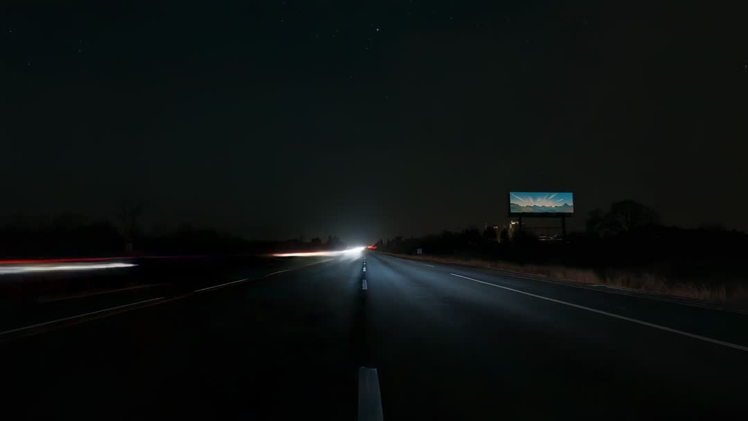 AI Generated Image. Video footage showing long stretch of rural highway at night with headlights and taillights creating continuous light trails along centerline. Oncoming headlights illuminating dashed center markers while illuminated billboard sitting on right shoulder under starry sky. Wide composition with strong leading lines drawing eye toward distant vanishing point, creating cinematic sense of motion and speed. Low ambient light and long-exposure technique emphasizing streaks and contrast between dark landscape and bright vehicle lights. Usage ideas: working well as background for travel and automotive videos, nighttime driving safety campaigns, technology or AI commercials, cinematic openers and transitions, website hero banners, social media ads, editorial stories about road infrastructure or rural life. Also useful for abstract design projects, poster art, mood-setting visuals in film and television. Technical notes: clip featuring long exposure light trails, motion blur, low-key lighting, centered perspective, available in landscape format.