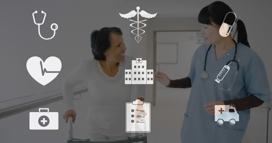 The video showcases a compassionate healthcare scenario where a female doctor is engaging with a senior patient using a walking aid. Various medical icons are overlaid, highlighting aspects of global medicine and digital healthcare. This visual is suitable for use in health-related publications, promotional material about elderly care, or advocating healthcare technology integration.