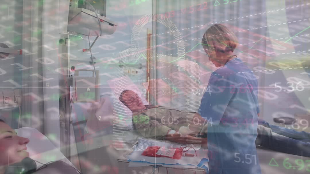 A futuristic amalgamation presents a female doctor attending to a patient in a hospital environment, overlaid with symbols of digital data such as binary codes and graphical lock icons representing data encryption and cybersecurity in healthcare. Suitable for illustrating the significance of secure health data management, innovative healthcare technology advances, and protecting patient confidentiality in medical settings.