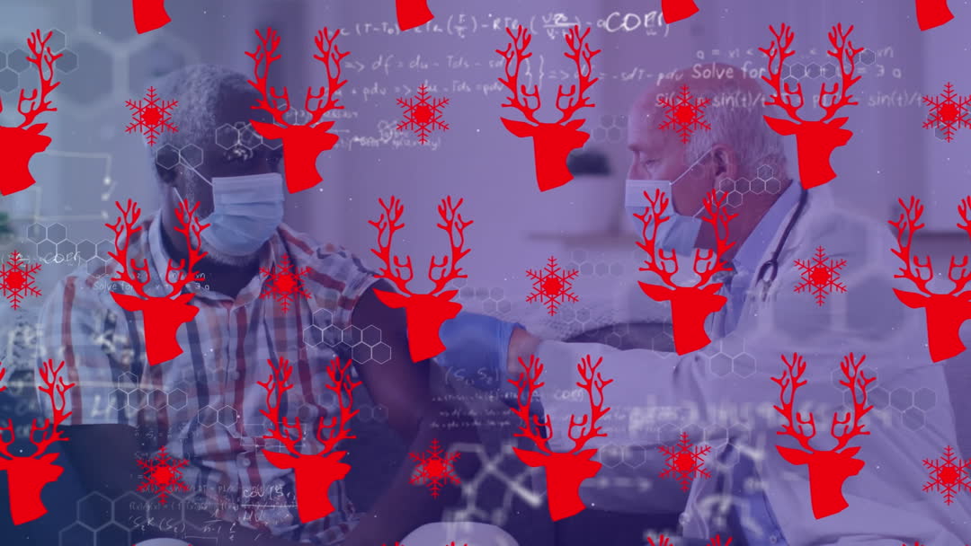 This visually engaging scene features a unique combination of healthcare and abstract global symbolism. Reindeer and mathematical equations overlay a doctor administering patient care, representing international aspects of medicine, digital technology, and problem-solving approaches. Useful for illustrating healthcare innovation, diverse medical practices, or conceptual medical articles.