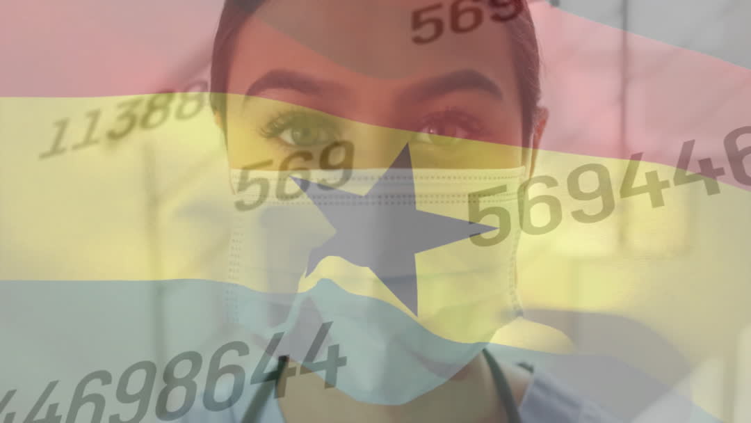 Doctor with a face mask appears, Ghana flag overlay highlights healthcare themes alongside floating numeric data. This is suitable for articles or presentations on medical innovation, health technologies, international healthcare partnerships, or data science in medicine, particularly focusing on healthcare developments in Ghana.