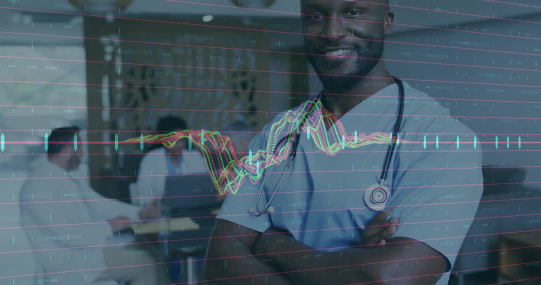 Depicts a confident doctor with an overlay of ECG data, symbolizing the integration of technology in medical analysis. Perfect for depicting themes of modern medical practice, teamwork in healthcare, and the role of technology in effective patient care. Suitable for articles, presentations, or content about medical innovations and professional healthcare settings.