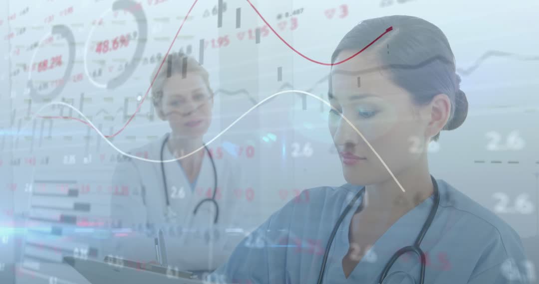 Healthcare scene displaying a focused professional analyzing patient data alongside evolving medical charts. Useful for illustrating themes related to modern healthcare, data-driven medicine, and the integration of technology in medical settings. Ideal for articles, presentations, or content emphasizing diagnostic accuracy and teamwork within hospital environments.