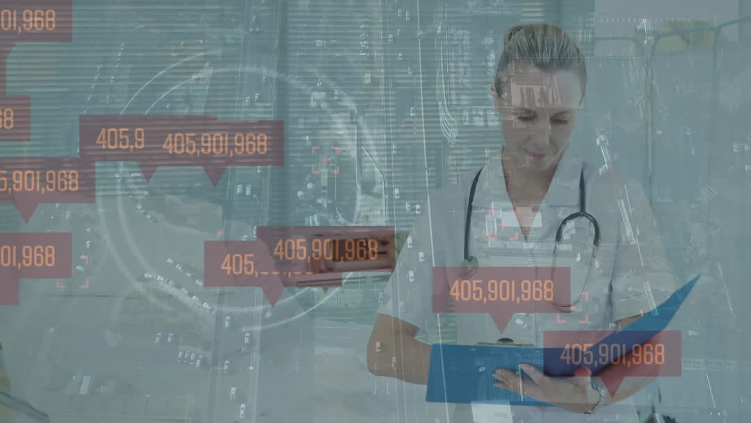 The visual shows a female doctor wearing medical attire as digital data overlays with numbers related to COVID-19. This concept blends healthcare expertise with data analytics focused on pandemics. It is ideal for illustrating technology's role in modern healthcare, research papers on COVID-19 data processing, or as a visual aid for articles discussing the integration of information technology and medical research. Use in presentations about pandemic preparedness or innovations in health data management.