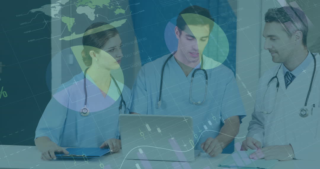 Three doctors are gathered around a laptop, engaged in data analysis discussions. The overlay of global maps and data graphs emphasizes the integration of technology in healthcare. This could be used in articles or presentations focusing on modern medical practices, the role of technology in healthcare, global medical trends, or team collaboration in hospital settings.
