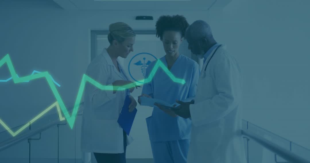 Medical professionals collaborate in hospital hallway analyzing important patient health data using digital devices. EKG line graph overlays connection to modern medical technology, emphasizing clinical data analysis and team collaboration. Useful for illustrating concepts of healthcare technology, teamwork in medicine, and digital advancements in patient care systems. This visual can enhance educational videos, health tech presentations, and healthcare marketing materials.
