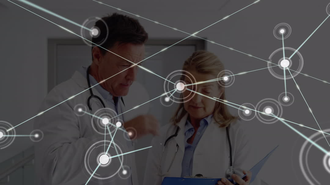 Two healthcare professionals discuss medical documents with superimposed network connections symbolizing integration of technology in healthcare. Perfect for illustrating themes of modern technology in medicine, medical data analysis, and hospital digital transformation.