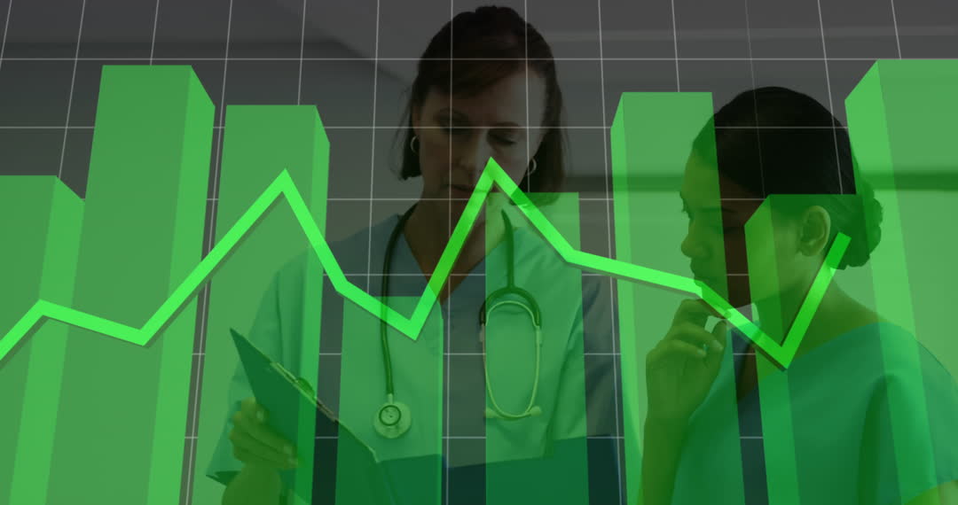 Image features healthcare professionals engaged in examining financial growth data represented through digital graphs overlaying their interaction. Useful for illustrating intersections between finance and healthcare, showcasing economic analysis within medical industry, or in content focusing on healthcare business strategies.