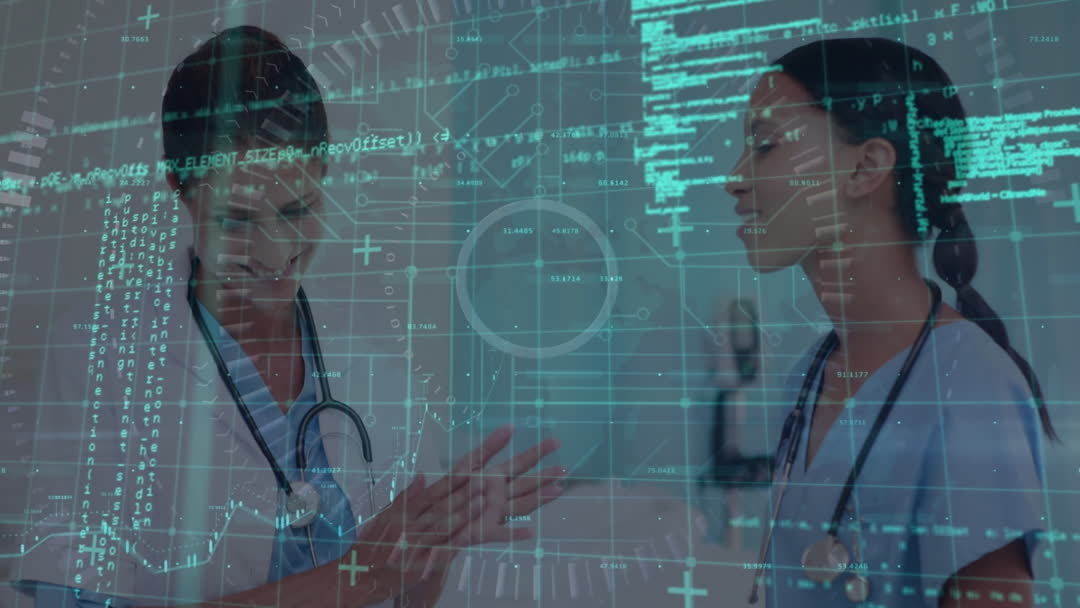 Two healthcare professionals are engaging with a digital interface overlay showing advanced medical data or simulation screens. They are standing in a hospital environment, with diverse representation, wearing medical scrubs and stethoscope. Useful for topics on modern healthcare, medical technology advancements, digital innovation in medicine, or teamwork in healthcare settings.