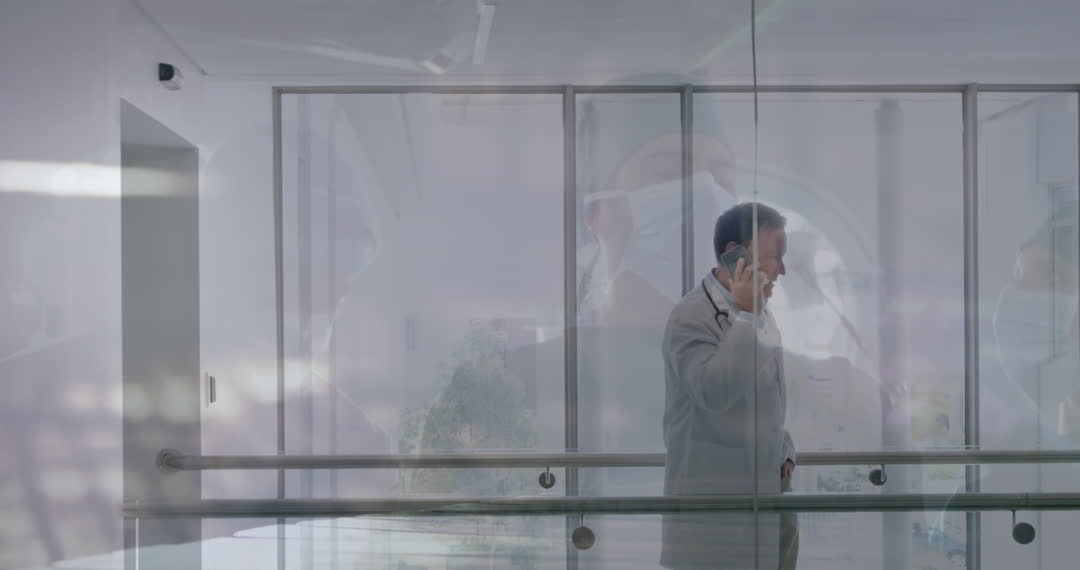 Doctors and a businessman are shown collaborating through overlaid videory, symbolizing integration of healthcare and business. Suitable for illustrating medical sectors engaging in corporate strategies or healthcare innovations. Perfect for promotional content in business health management, medical office interior decoration, or communication in healthcare institutions.