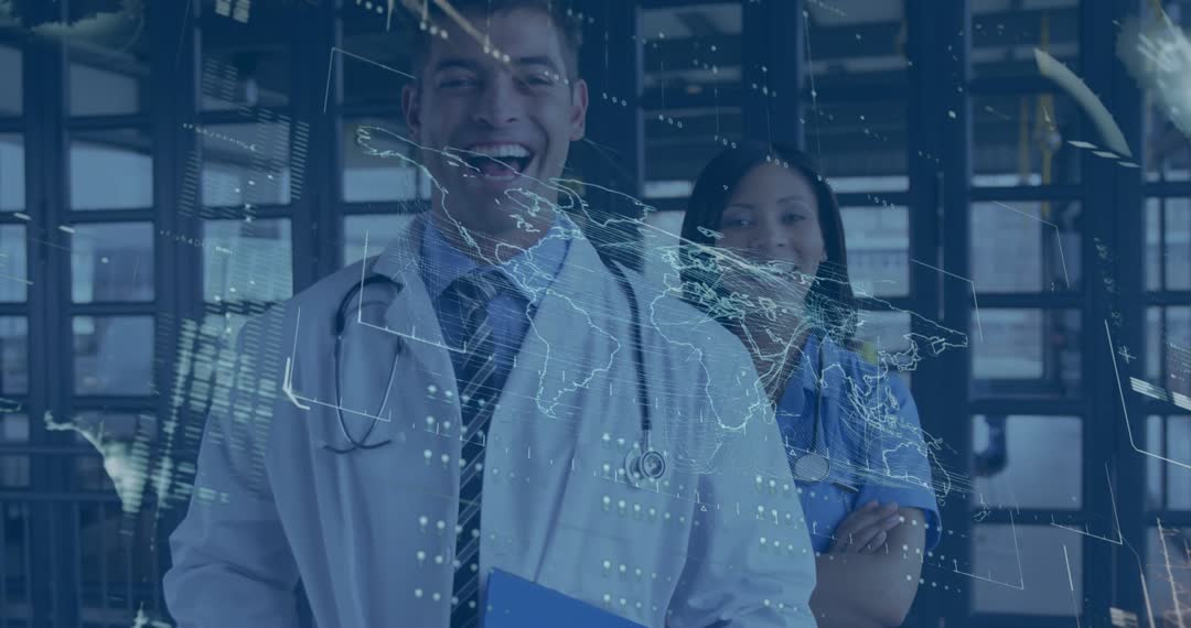 Healthcare professionals working digitally behind animated map, promoting modern medicine and technology integration in hospitals. Stethoscope around doctor's neck symbolizes medical expertise. Ideal for illustrating healthcare technology advancements, medical team collaboration, or hospital efficiency improvements.