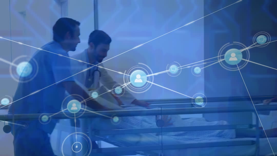 Scene illustrates integration of technology within healthcare. Overlay of digital network connections with medical staff is symbolic of communication and support systems in healthcare environments. Useful for demonstrating advancements in hospital technology and collaboration in medical fields.