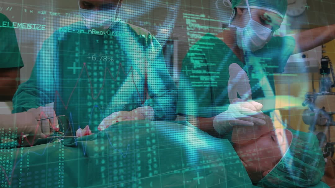 Healthcare professionals in surgical gowns performing an operation as digital data overlays suggesting advanced medical technology integration. Useful for illustrating advancements in medical technology, futuristic surgery methods, and innovation in healthcare systems.