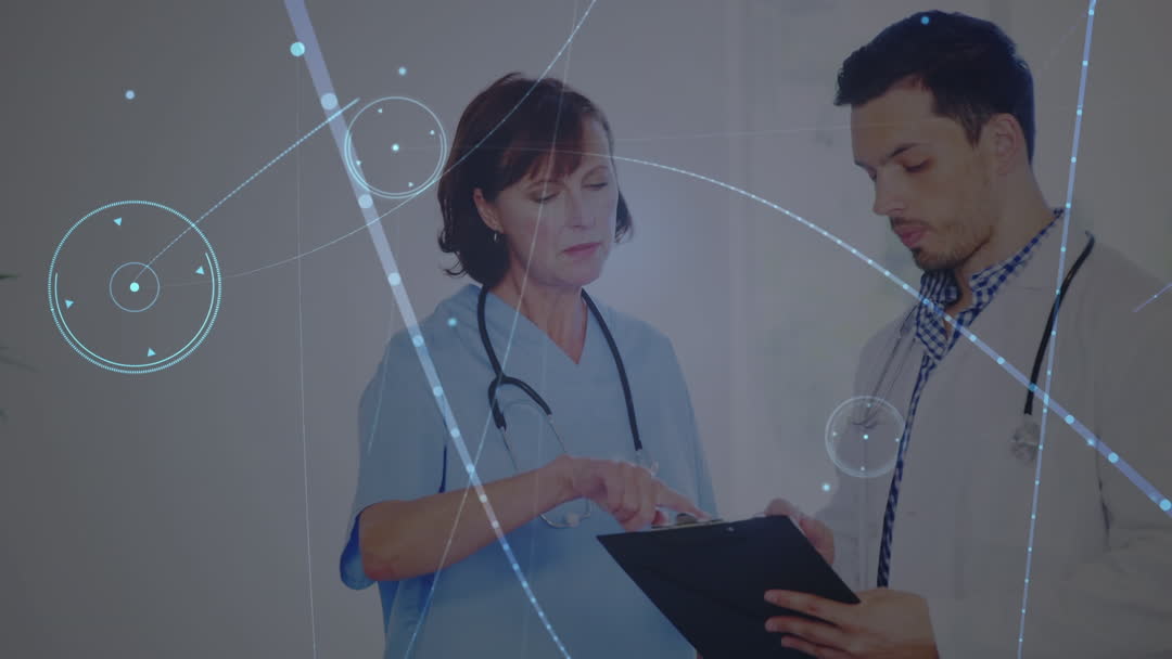 The video shows a female nurse and a male doctor discussing and reviewing patient information, with digital graphics symbolizing connectivity and innovation overlayed. The scene suggests the integration of healthcare and digital technology. Useful for illustrating modern medical practices, technology in healthcare, and professional collaboration in medical settings.