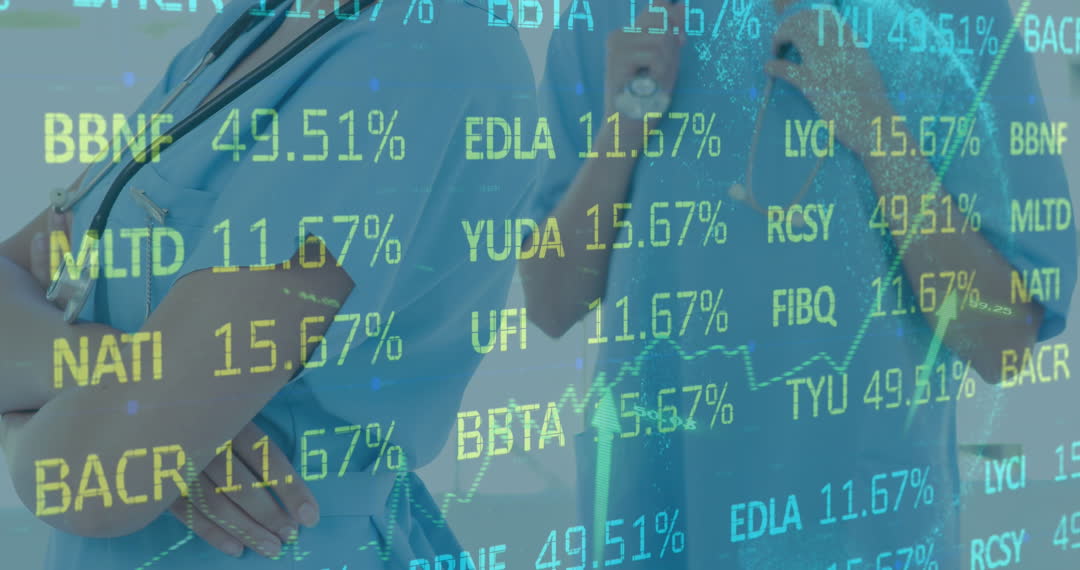 Image of healthcare professionals, specifically two female doctors, overlayed with dynamic stock market data representing the intersection of finance and healthcare technology. Useful for demonstrating concepts like the impact of economic trends on the medical sector, healthcare innovation driven by financial investment, and the relationship between global markets and healthcare services. This video can be used in articles, presentations, or advertisements related to healthcare economics, financial investment in healthcare, and transformative technology in the medical industry.