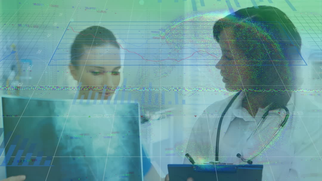 The video depicts two female doctors examining an x-ray, overlaid with financial graphs and data. This combination of healthcare and technology highlights integrated modern medical research practices. Suitable for use in articles about digital advancements in healthcare, the merging of technology with medical science, or informative content related to healthcare analytics.