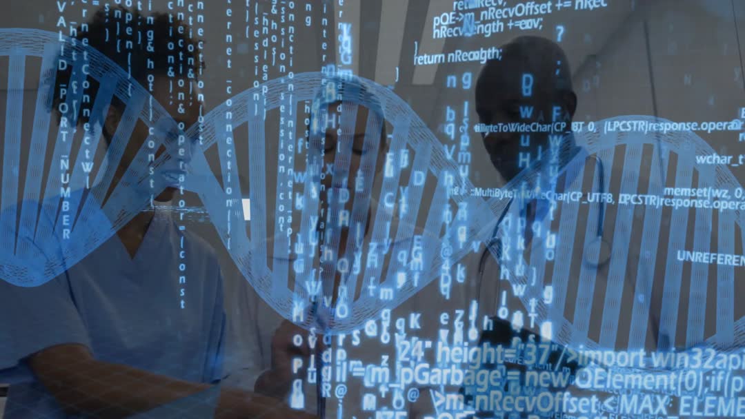 Healthcare researchers in lab examine projected DNA helix with streaming code, reflecting intersection of biotechnology and digital innovation. Ideal for illustrating cutting-edge scientific research, medical technology advancements, and collaborative innovation in healthcare. Useful for media relating to genetic research, bioinformatics, and technological collaborations in scientific fields.