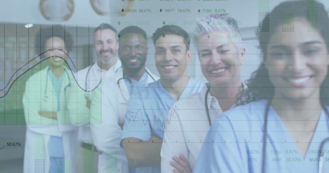 Healthcare Team with Financial Data Overlays in Clinic Video