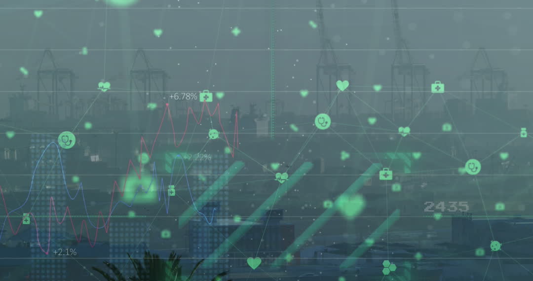 This digital composition blends healthcare icons and graphs with a cityscape backdrop, symbolizing the integration of digital technology and data analytics in urban healthcare systems. It indicates the connection between healthcare services and technological innovation. Useful for articles and presentations on healthcare technology advancements, smart city healthcare solutions, and the role of data in medical sectors.