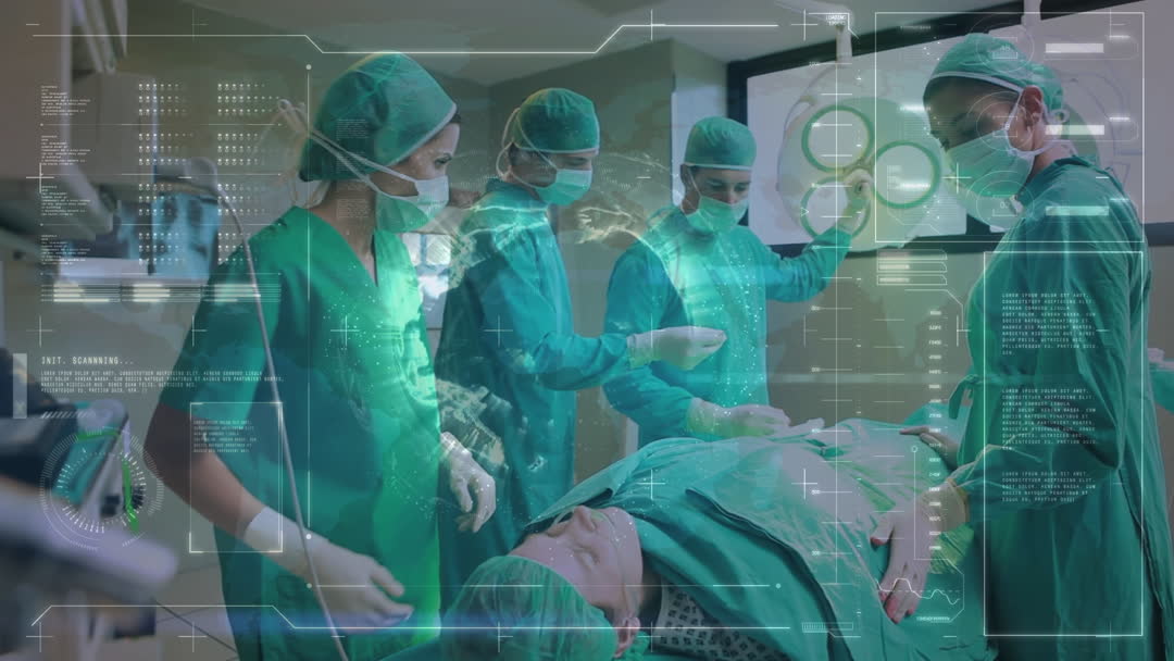 A team of doctors performing surgery with a digital interface overlay, suggesting innovation in healthcare. This can be used in medical articles about modern technology, teaching materials on digital advancements in medicine, or within presentations that focus on global medical innovations.