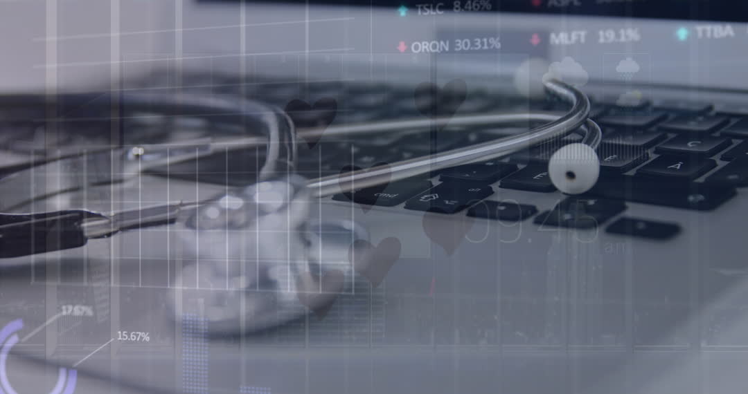 An illustrative composite showcasing the interconnectedness between healthcare technology and finance. A stethoscope placed on a laptop surfaces a blend of technology with medical tools, essential in the digital era for healthcare data management. Ideal for topics related to global economic trends in healthcare, financial data analysis, digital health integration, or financial investments in medical technology sectors.