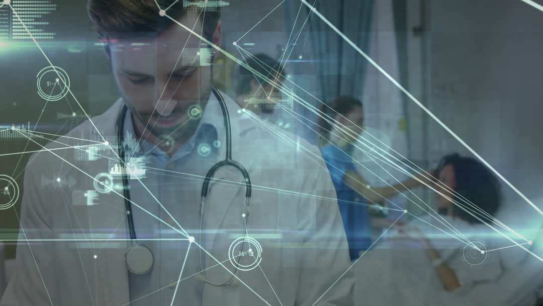 Caucasian male doctor engaging with technology overlay, symbolizing the integration of advanced networks in medical settings. Usage includes digital healthcare marketing, telemedicine promotions, innovations in medical technology, and health informatics training materials.