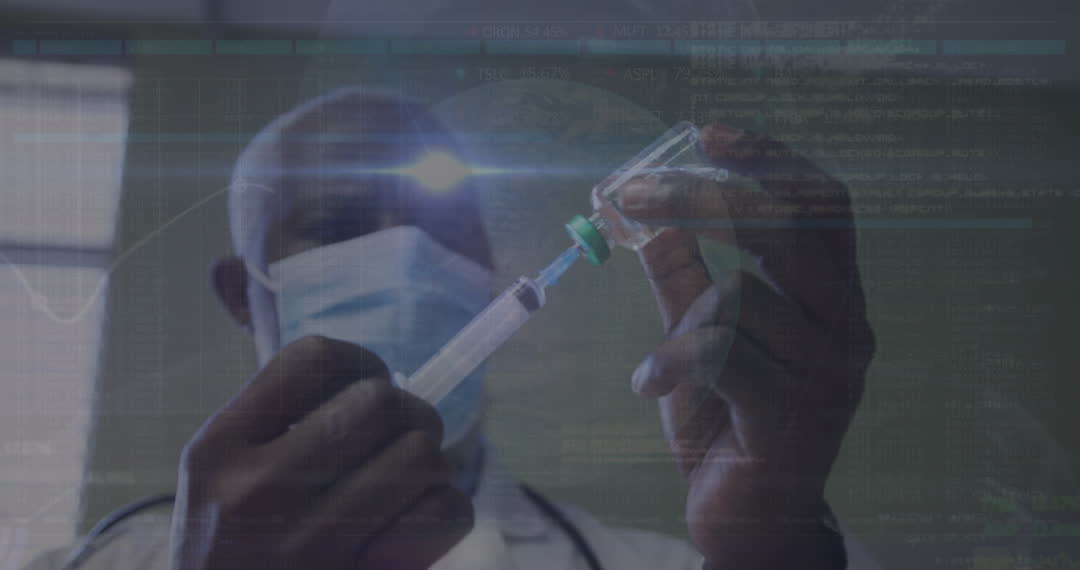 Depicting the fusion of healthcare and technology, this visual showcases a doctor preparing a vaccine with a digital data interface overlay. Perfect for illustrating concepts related to medical innovation, digital health solutions, and advancements during the Covid-19 pandemic. Ideal for use in articles, presentations, and materials focused on healthcare technology and vaccination efforts.