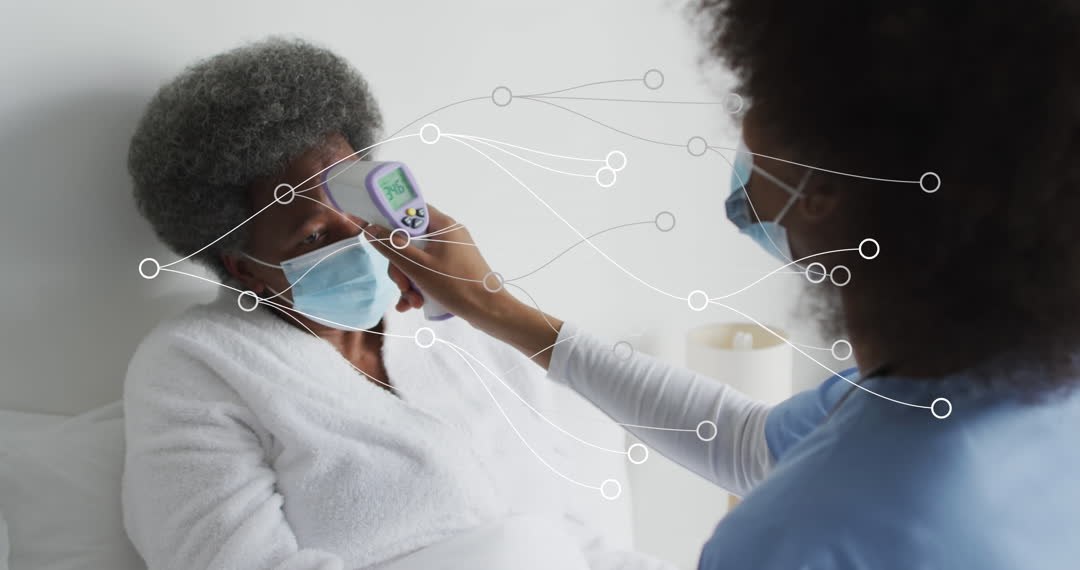 Nurse uses infrared thermometer to monitor elderly patient's temperature. Both wear masks, emphasizing health safety. Overlay of abstract patterns suggests technology, data use in healthcare. Useful for illustrating modern healthcare practices or technology use in medical settings.
