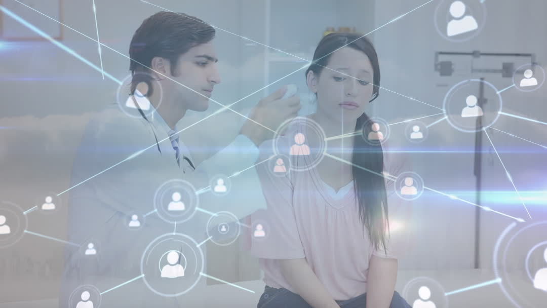 This video showcases the integration of technology in modern healthcare settings., with a diverse doctor conducting an ear examination on a female patient overlaid. This depiction highlights connectivity and communication through network graphics, symbolizing digital patient care advancements. This can be used in articles, presentations, and marketing materials related to innovative health technologies, telemedicine, and digital communications.