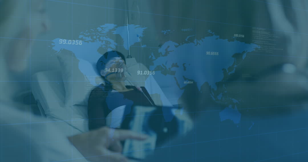 An innovative concept combining healthcare technology with financial data visualization. A world map and financial data overlays scene of diverse female doctors and patient in hospital. Ideal for illustrating smart healthcare systems, global medical innovations, or intersection of health and economics in a tech context.